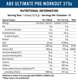ABE Ultimate Pre-Workout es el complemento pre-entrenamiento más vendido en Europa, que combina una mezcla única de los ergogénicos y ingredientes de rendimiento más investigados para potenciar tu rendimiento físico, reducir el cansancio y la fatiga*, y mejorar la concentración durante tus sesiones de entrenamiento. La creatina monohidrato puede aumentar el rendimiento físico en ráfagas sucesivas de ejercicio de alta intensidad a corto plazo.
