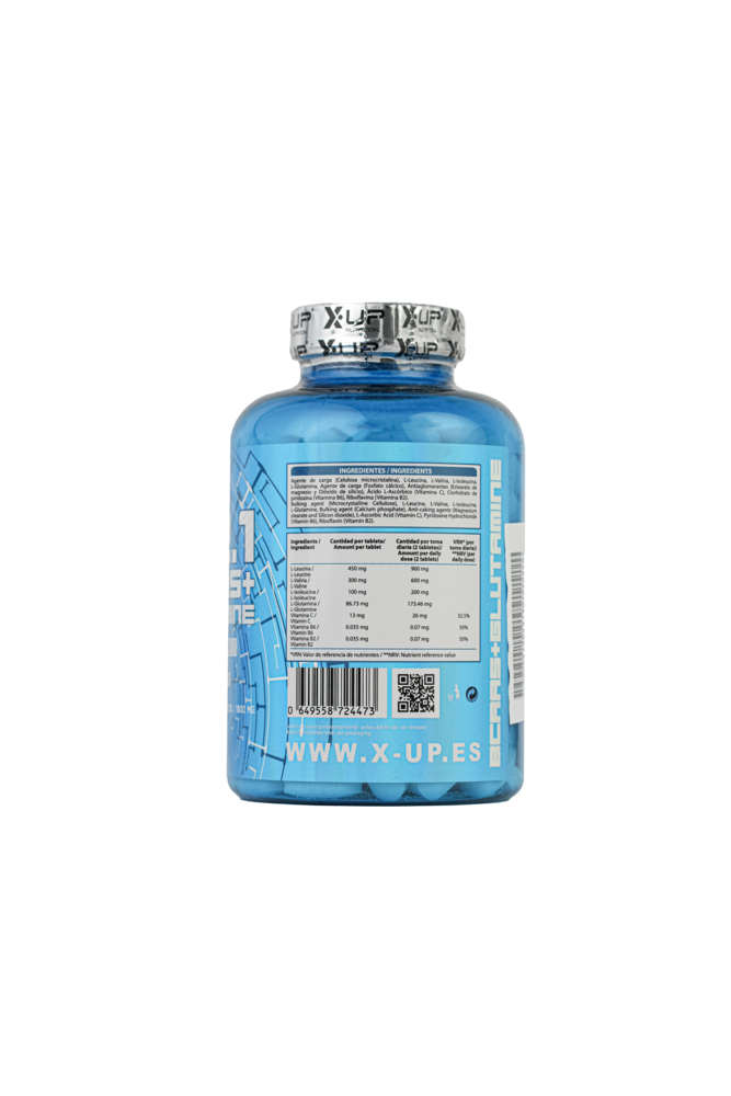 Agente de carga (Celulosa microcristalina), L-Leucina, L-Valina, L-Isoleucina, L-Glutamina, Agente de carga (Fosfato cálcico), Antiaglomerantes (Estearato de magnesio y Dióxido de silicio), Ácido L-Ascórbico (Vitamina C), Clorhidrato de piridoxina (Vitamina B6), Riboflavina (Vitamina B2).