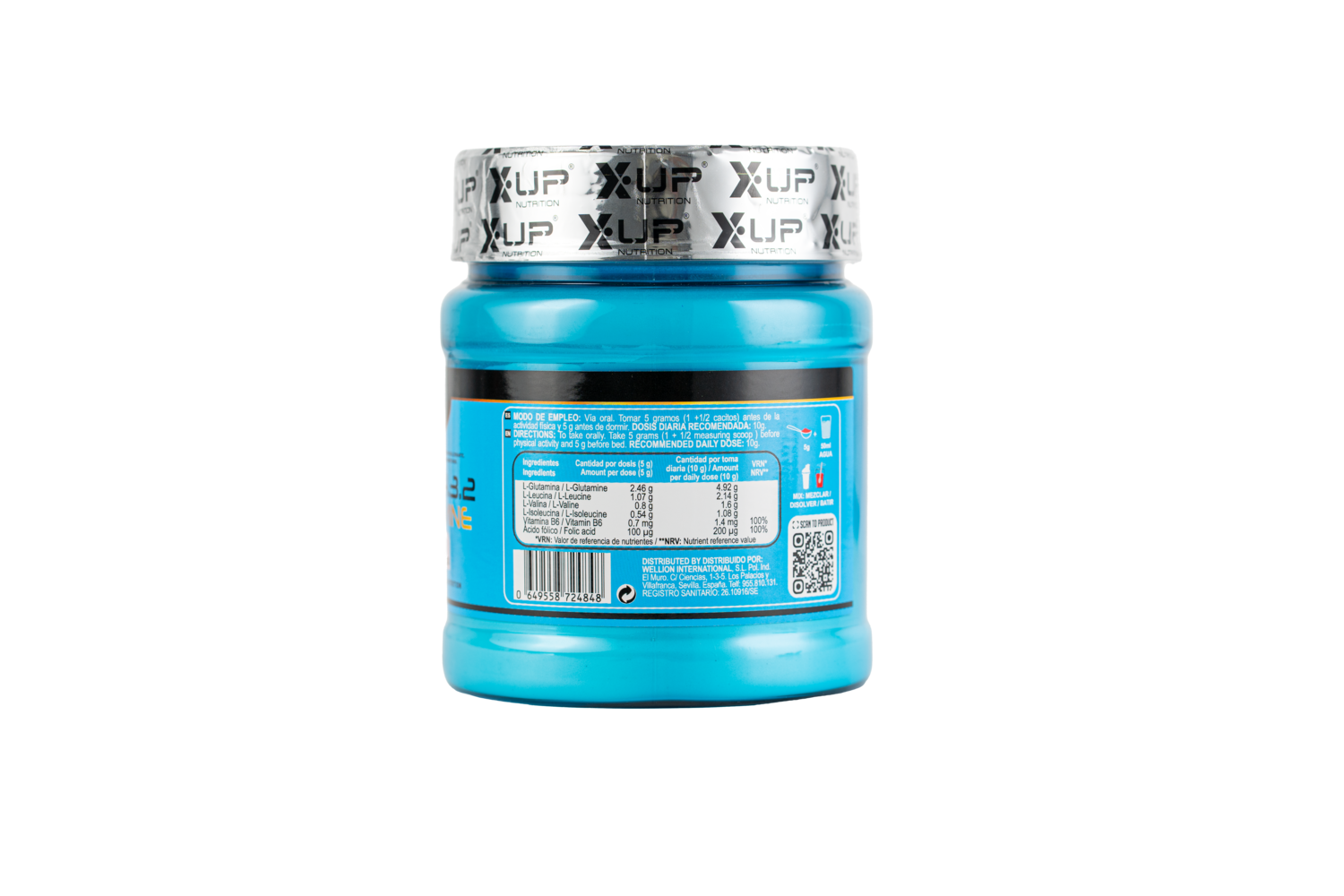 L-Glutamina, L-Leucina, L-Valina, L-Isoleucina, aroma, edulcorante (Sucralosa), colorante E-124, Clorhidrato de piridoxina (vitamina B6) y Ácido pteroilmonoglutámico (Ácido fólico).