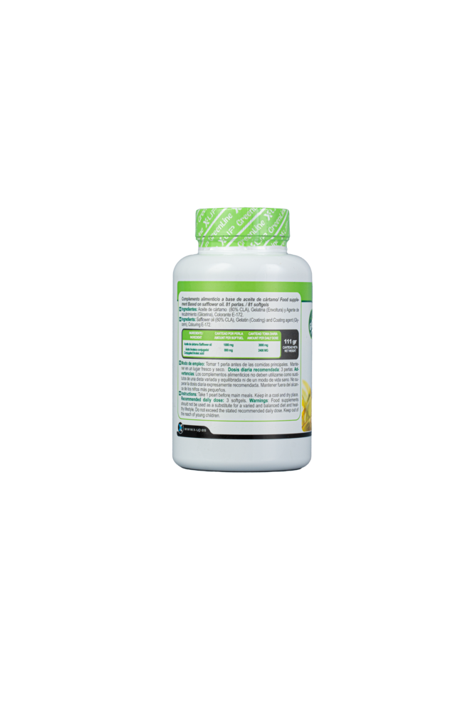 INGREDIENTES: Aceite de cártamo (80% CLA), Gelatina y Glicerina (Envoltura), Colorante E-172
