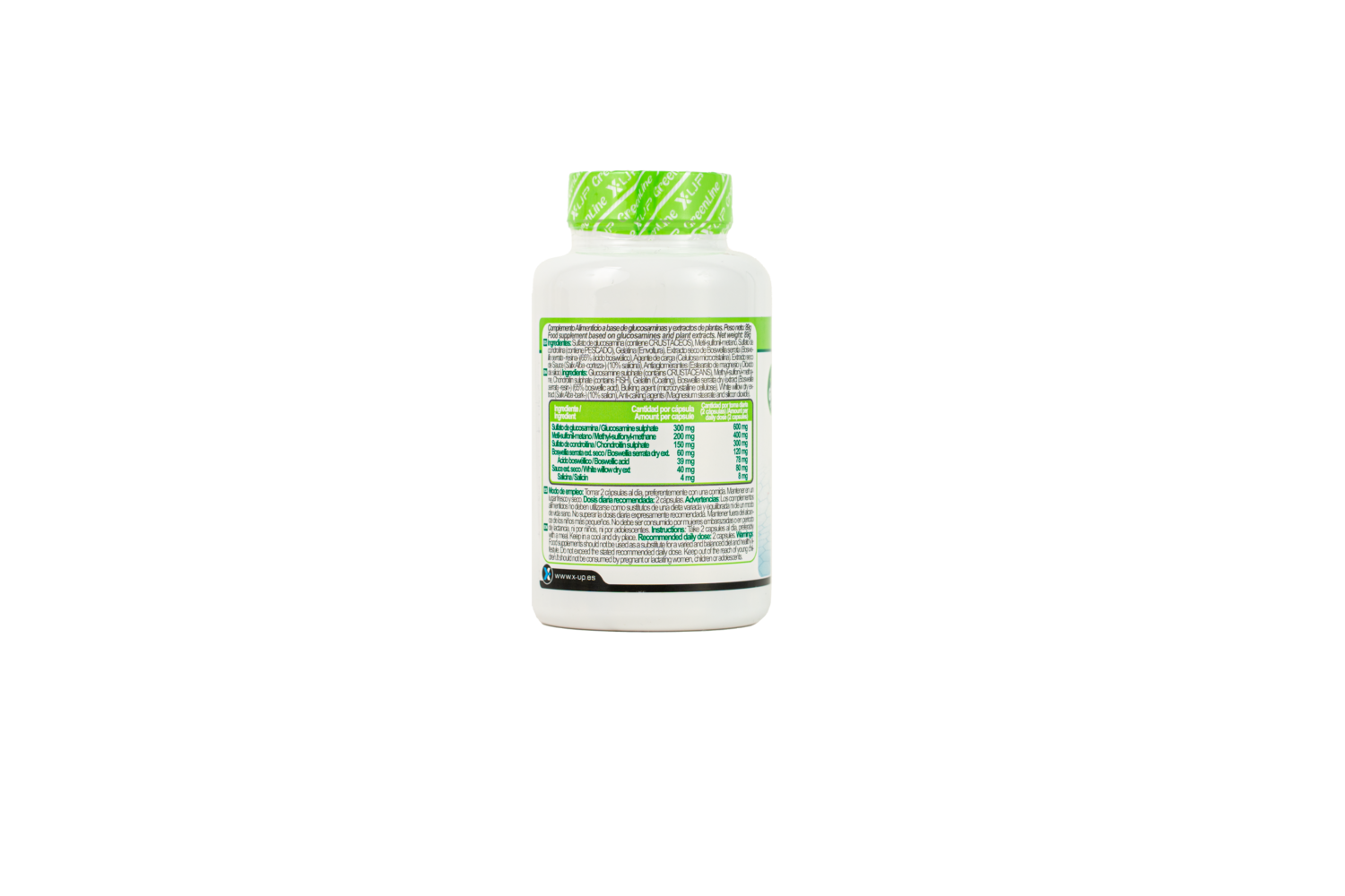 INGREDIENTES: Sulfato de glucosamina (contiene CRUSTÁCEOS), Metil-sulfonil-metano, Sulfato de condroitina (contiene PESCADO), Gelatina (Envoltura), Extracto seco de Boswellia serrata (Boswellia serrata - resina-)(65% ácido boswélico), Agente de carga (Celulosa microcristalina). Extracto seco de Sauce (Salix Alba -corteza-) (10% salicina), Antiaglomerantes (Estearato de magnesio y Dióxido de Silicio).