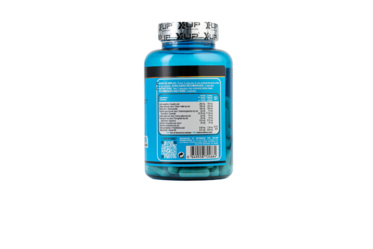 INGREDIENTES: Ácido D-Aspártico, Extracto seco de ortiga verde (Urtica dioca -hojas-), Agente de carga (Fosfato cálcico), Agente de recubrimiento (Hidroxipropilmetilcelulosa), Maca (Lepidium meyenii -raíz-), Extracto seco de sophora japonica (Sophora Japonica -brote-)(95% quercetina), Extracto seco de AVENA Sativa (Avena Sativa L -hierba-) (contiene GLUTEN), Extracto seco de fenogreco TESTOFEN (Trigonella foenum-graecum L -semillas-) (50% saponinas), Extracto seco de Garcinia Mangostana (Garcinia Mangostana L-fruto-), Antiaglomerantes (Estearato de magnesio y Dióxido de silicio), D-Pantotenato cálcico (Ácido pantoténico), Clorhidrato de piridoxina (Vitamina B6).