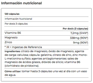Ingredientes: citrato de magnesio, óxido de magnesio, agente de carga: celulosa; cápsula: gelatina, citrato de zinc, zinc mono-L-metionina sulfato; agentes antiaglomerantes: sales de magnesio de ácidos grasos, dióxido de silicio; vitamina B6 (clorhidrato de piridoxina).